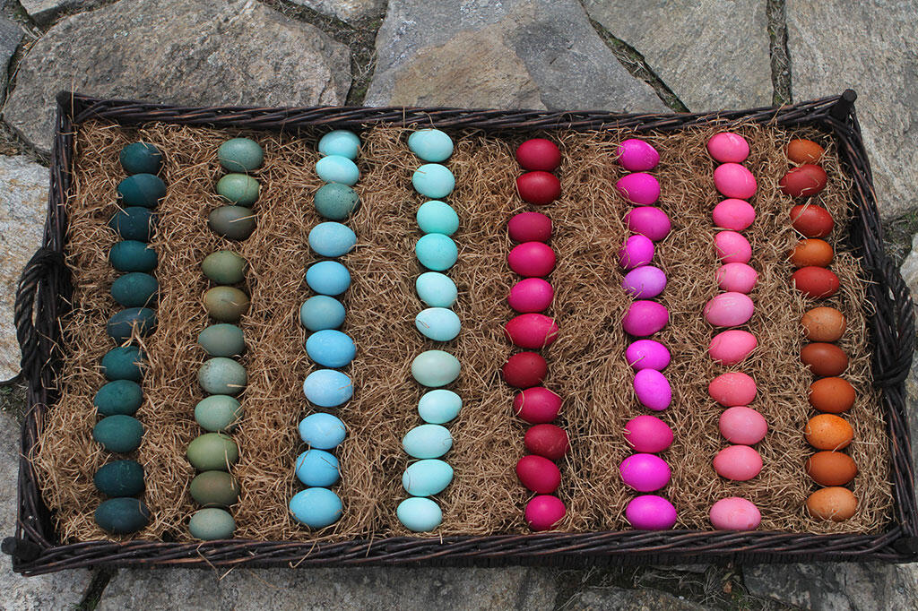 the eggs are naturally blue,brown and chocolate colored- they dye much more vibrantly than white eggs-mccormicks vegetable food coloring